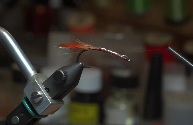 Cover the shaft of the tail feather with thread all the way to the front of the body, clip the surplus and take the thread back to the rear of the fly