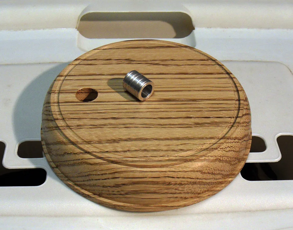 The finished bottom plate with a hole for the bearing bush to secure the vertical wooden part.