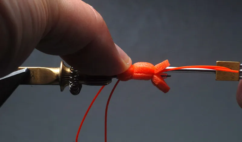 Now, tie down the rear of the foam. Grab it tightly and pass the thread over it, compressing it in a narrow groove.