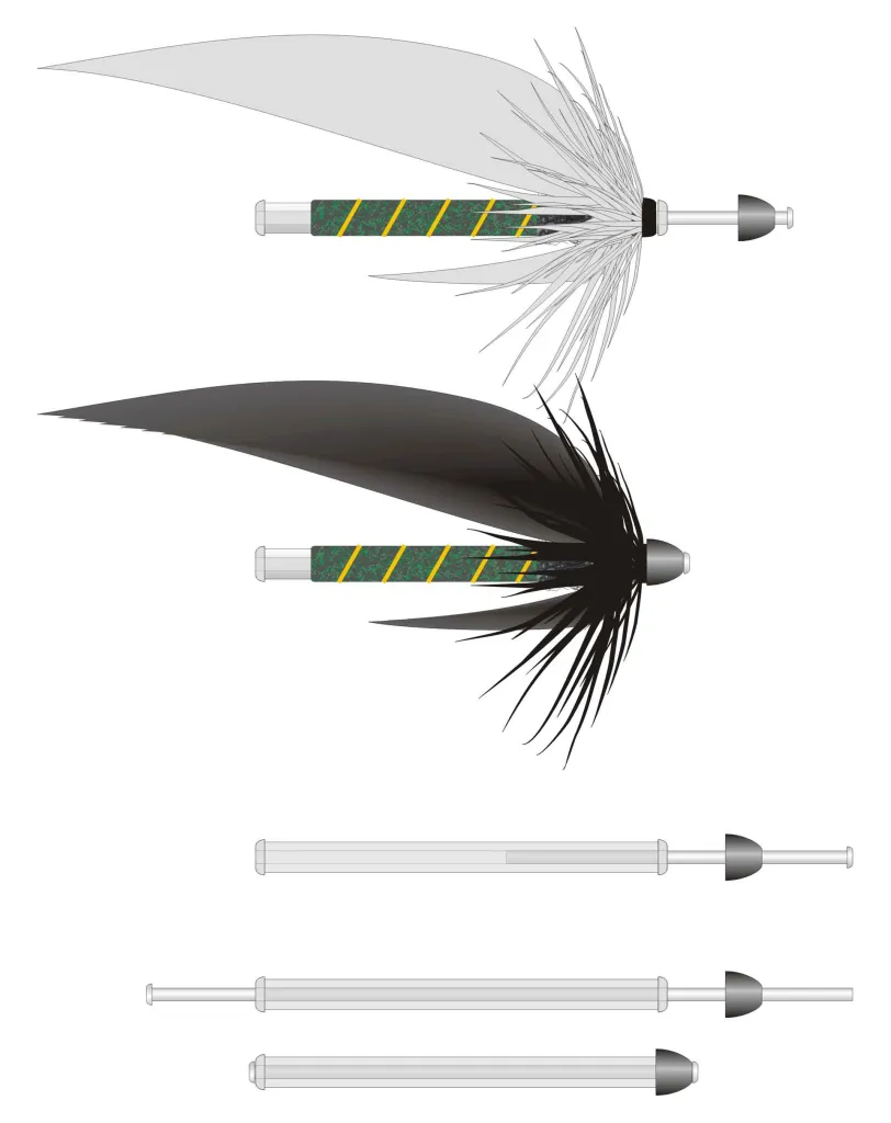 This is the more traditional way of finishing a cone headed fly. Tie the fly solely on the thicker outer tube. Finish it with wing and hackle and as small a head as possible and slip the inner tube into the cone and into the outer tube after having melted a collar to keep it in place. You will need to glue the inner tube inside the outer using instant glue.