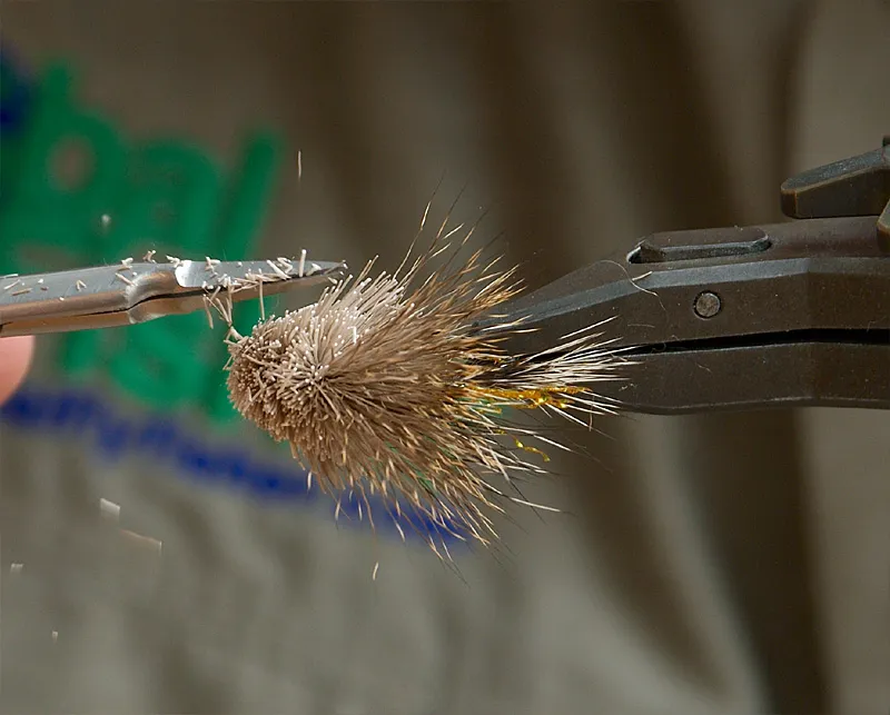 Start trimming the top and bottom from the front of the fly. Then trim the sides and then rotate the fly while rounding it more and more - still from the front. If your vise doesn't rotate, hold the fly in the hand while doing this.