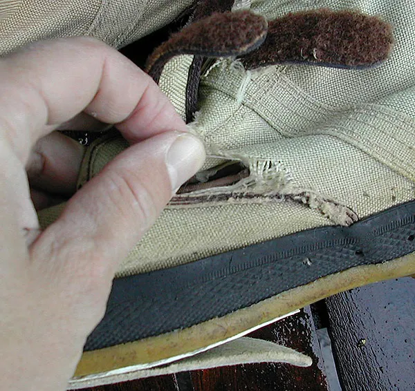 These are cheap Chinese fabric boots. They are inexpensive and must be expected to have a limited lifespan. As you can see the fabric itself is worn through and the felt is coming off. Still these boots lasted me as long as some of the more expensive ones I have owned.