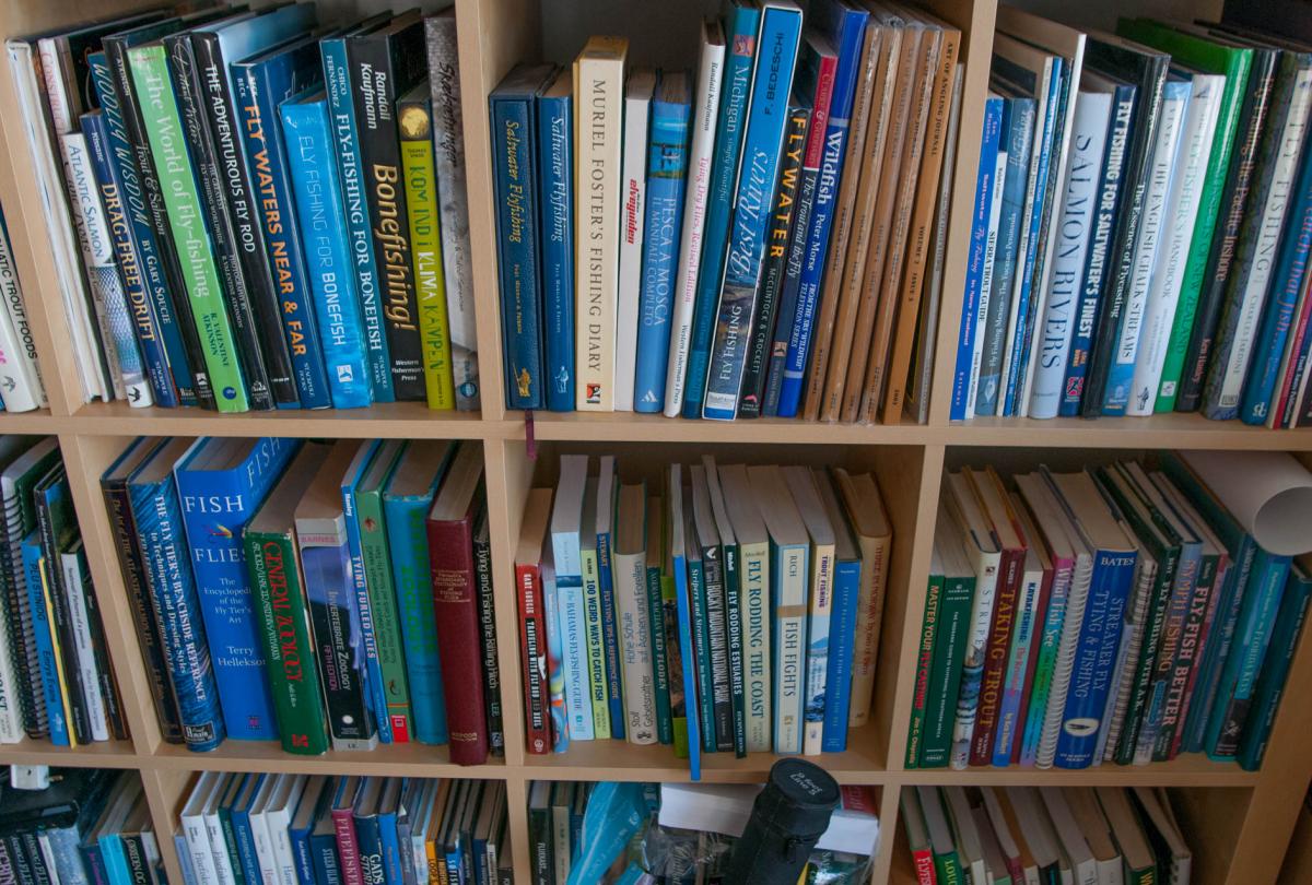 If I turn my chair 180 degrees as I write this I will see my fly fishing bookshelves, which do not comprise a whole wall in the room but a fair part of the shelves on that wall. I haven't counted my fishing books, but a quick estimate is that I have about 250-300 fishing books.