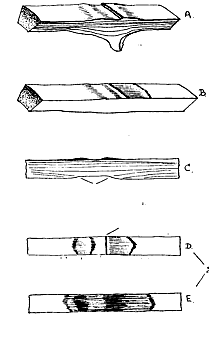 Now we come to the splitting, that can be a very difficult job - but we use a method learned from Bjarne Fries - another clever Danish rod-builder. In a vice we place a knife-blade with the point upwards and protected by a metal-ball (so that one doesn't harm oneself during the splitting). The edge of the knife pointing towards you. In preparation one has with a speed-marker drawn short lines along the whole bamboo-piece, where it is to be be split. Then the end is pressed against the edge of the knife and during the whole splitting-process the surface of the bamboo must be exactly at an angle of 90 deg. to the knife. Then one presses the bamboo against the knife and as a start it can be needed to make a short 'rap' at the other end of the bamboo. By pressing the bamboo against the knife the bamboo is split: One keeps ones hands as close to the knife as reasonable, and following the marks the total length is split. Should it move out of range one presses with one of the hands at the side of the bamboo just to the side of the knife, so that the split goes back on the right course.