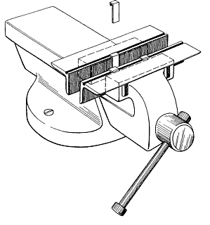 On the other side we remove a small part of the nodes - only the very sharp edge is filed away - the rest of the nodes are pressed down in the way the famous Jim Payne did it. We do it between the jaws of a vice after having heated the node. One has to place some softer blades of metal between the jaws, so that no unwanted marks are left on the surface of the bamboo. (As Ib works with splits with the final 60 deg. planes, he has to use an insertion between the jaws of the vice like a small planning form on the one side and a flat one on the other). By this procedure he 'removes' the nodes and in the same process correct any bends etc. in the splits...