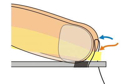 With the counterclockwise twist the thread will seek towards the fingers (blue arrow) and help the thread down on the material close to the fingers.